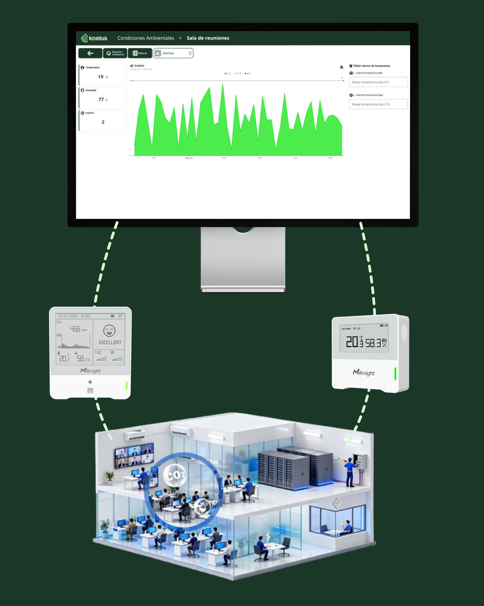 At Koelus, we offer a solution that allows continuous and automatic monitoring of environmental factors such as temperature, humidity, and CO₂ in all types of environments, providing a simple and robust tool for real-time visualization of the status of all monitored points through the Koelus Platform.