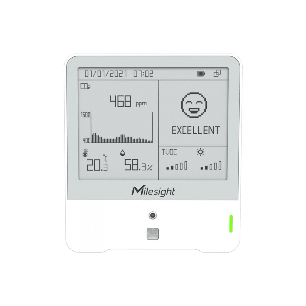 MI-AM307 is a compact LoRaWAN® sensor with an integrated display that measures temperature, humidity, CO2, TVOC, pressure, lighting, and motion, allowing real-time monitoring of indoor environments and comfort.